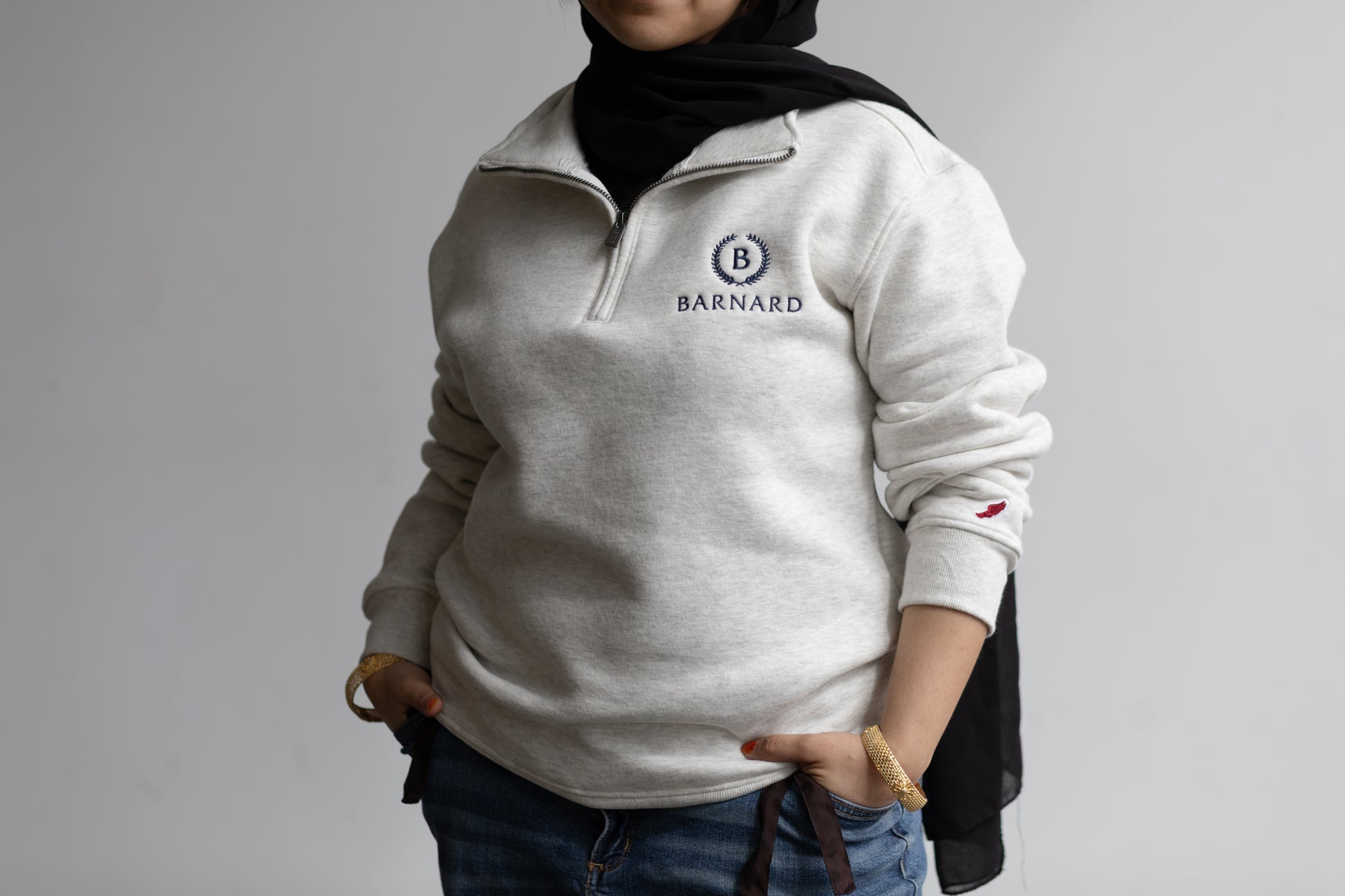 This quarter zip sweatshirt is perfect for fall and early winter. It comes with a stand collar and Jersey lined Kangaroo pockets with the Barnard laurel and wordmark on the chest.